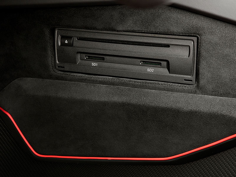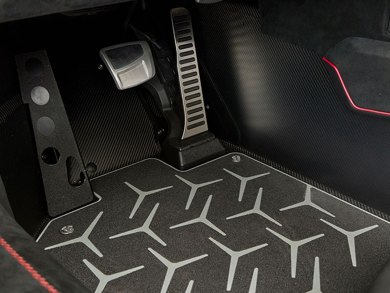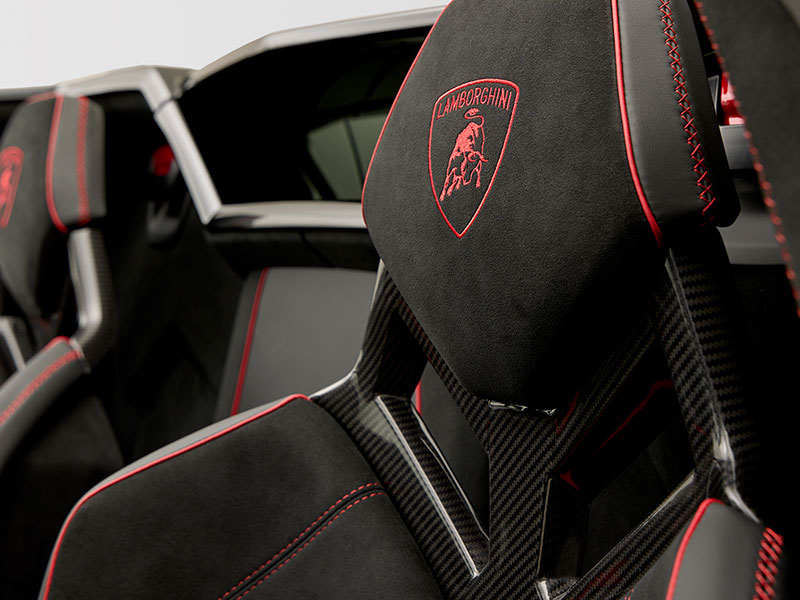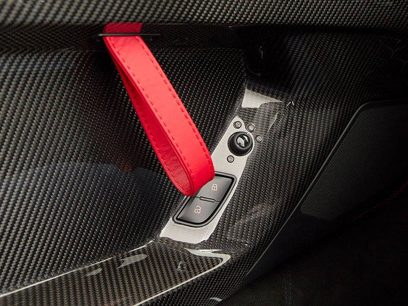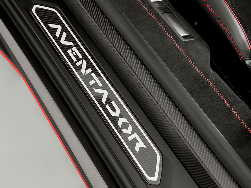 もちろん、ドア下のスカッフプレートにもAventadorのロゴが刻まれています。フロアから続く部分にもレッドのクロスステッチが施されています。これらの領域にもカーボンファイバーパーツが使用されています。