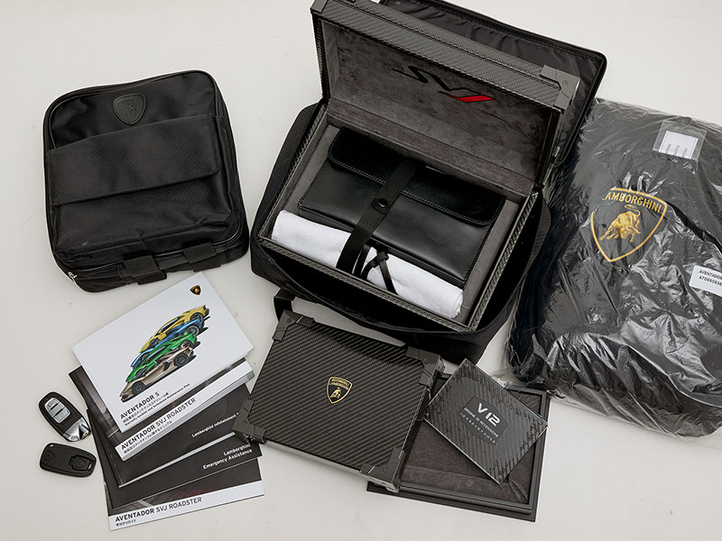 取扱説明書、整備記録簿、スマートキーなどの付属品一式が揃っています。さらに、カーボンとアルカンターラ素材の専用ボックスも付属します。